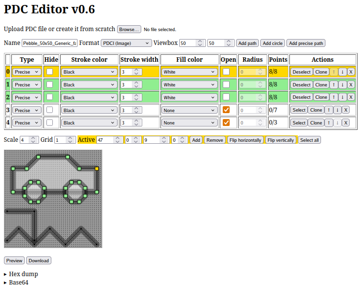 PDC Editor is a web graphical editor for PDC files I made and used when creating Naive watchface. Tool was created to enable working with binary values of PDC as directly as possible using graphical UI.