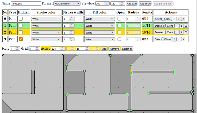 My current situation is that I don’t have desired PDC files with shapes for my fonts. I want maximum precision and Inkscape is a pain. I want to work with PDC format directly. So I’m working on another tool with web interface that will have graphical editor. I will give myself few days to make it. If I fail then I’m going back to Inkscape and just suffer through it.