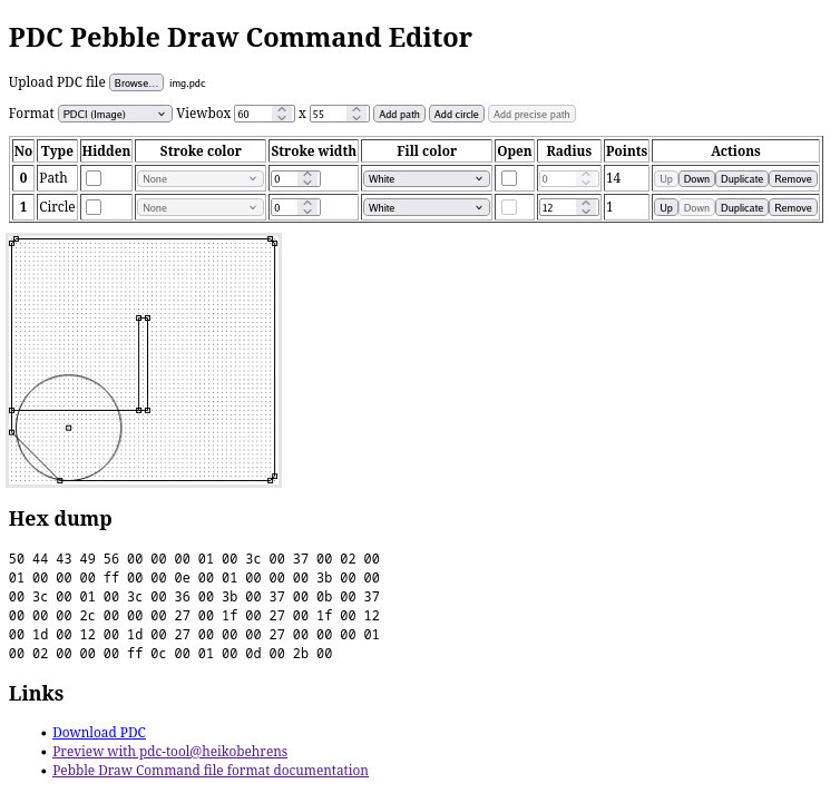 Last time when I needed PDC I created SVG with Inkscape and converted them using svg2pdc.py. But this time I just can’t make Inkscape produce desired SVG. It always adds some kind of transform or groups or strange values in viewbox. Even after cleaning with SVG optimizer results are not ideal. Because of that I’m trying to work PDC format directly.